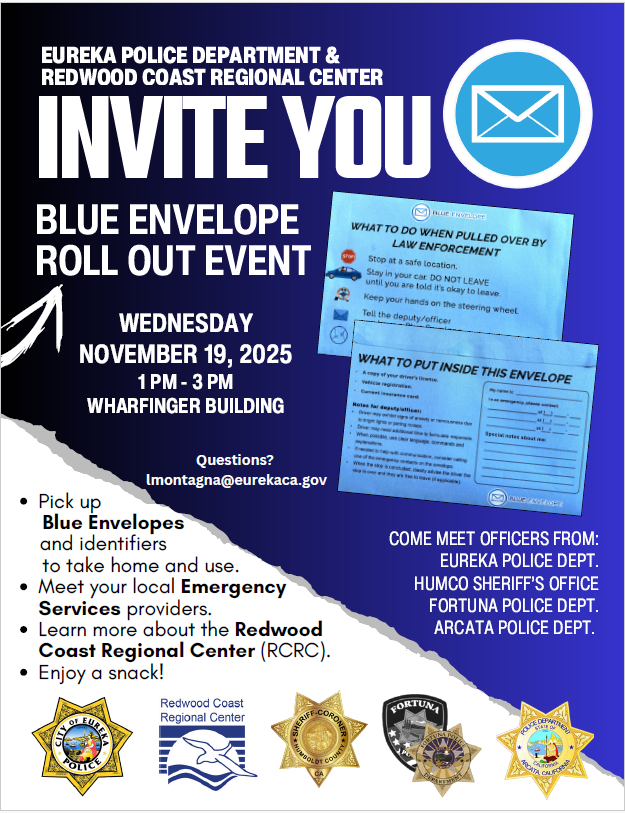 RCRC will be partnering with the Eureka Police Department to host a Blue Envelope Program Kickoff Event at the Wharfinger Building on November 19 from 1pm-3pm.