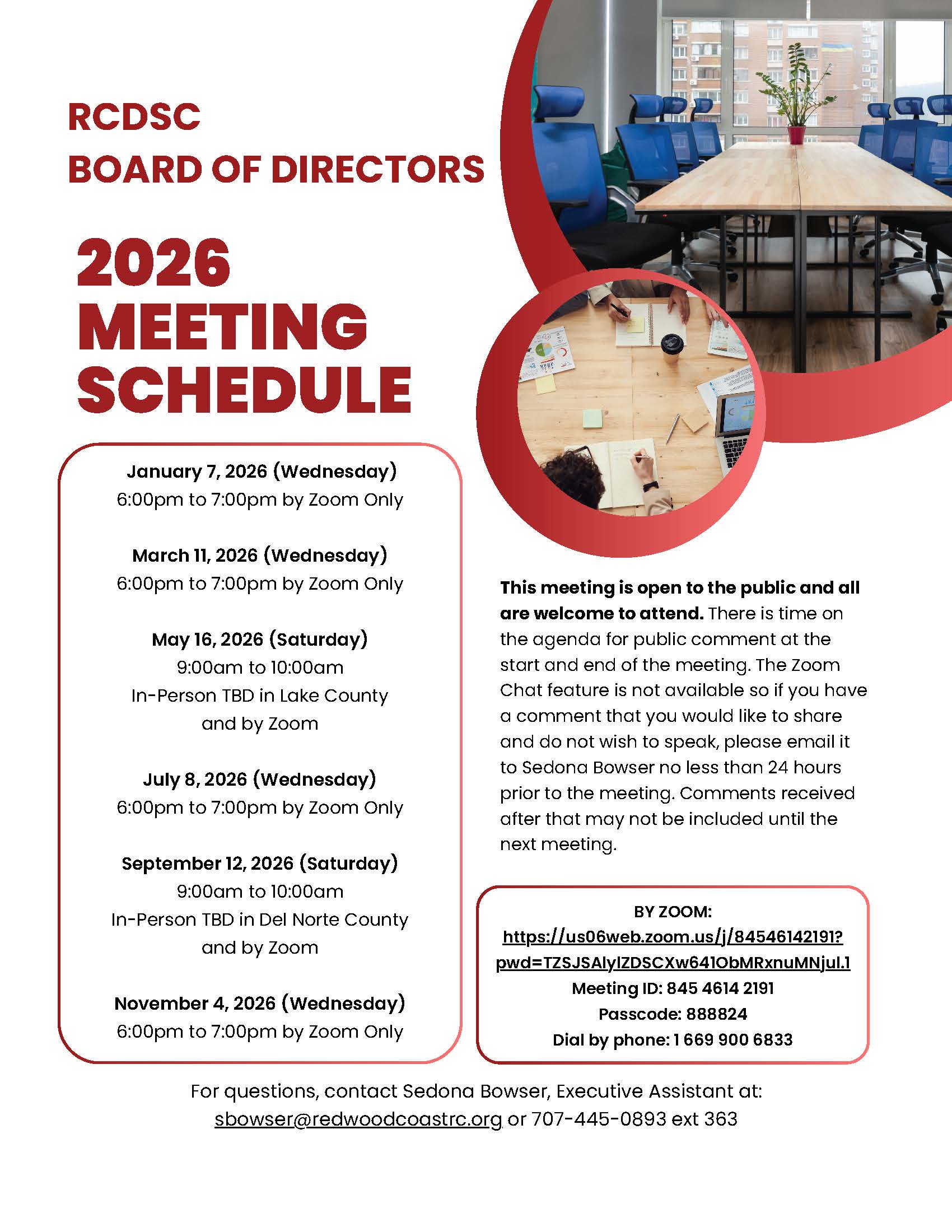 This meeting is open to the public and all are welcome to attend. There is time on the agenda for public comment at the start and end of the meeting. The Zoom Chat feature is not available so if you have a comment that you would like to share and do not wish to speak, please email it to Sedona Bowser no less than 24 hours prior to the meeting. Comments received after that may not be included until the next meeting.