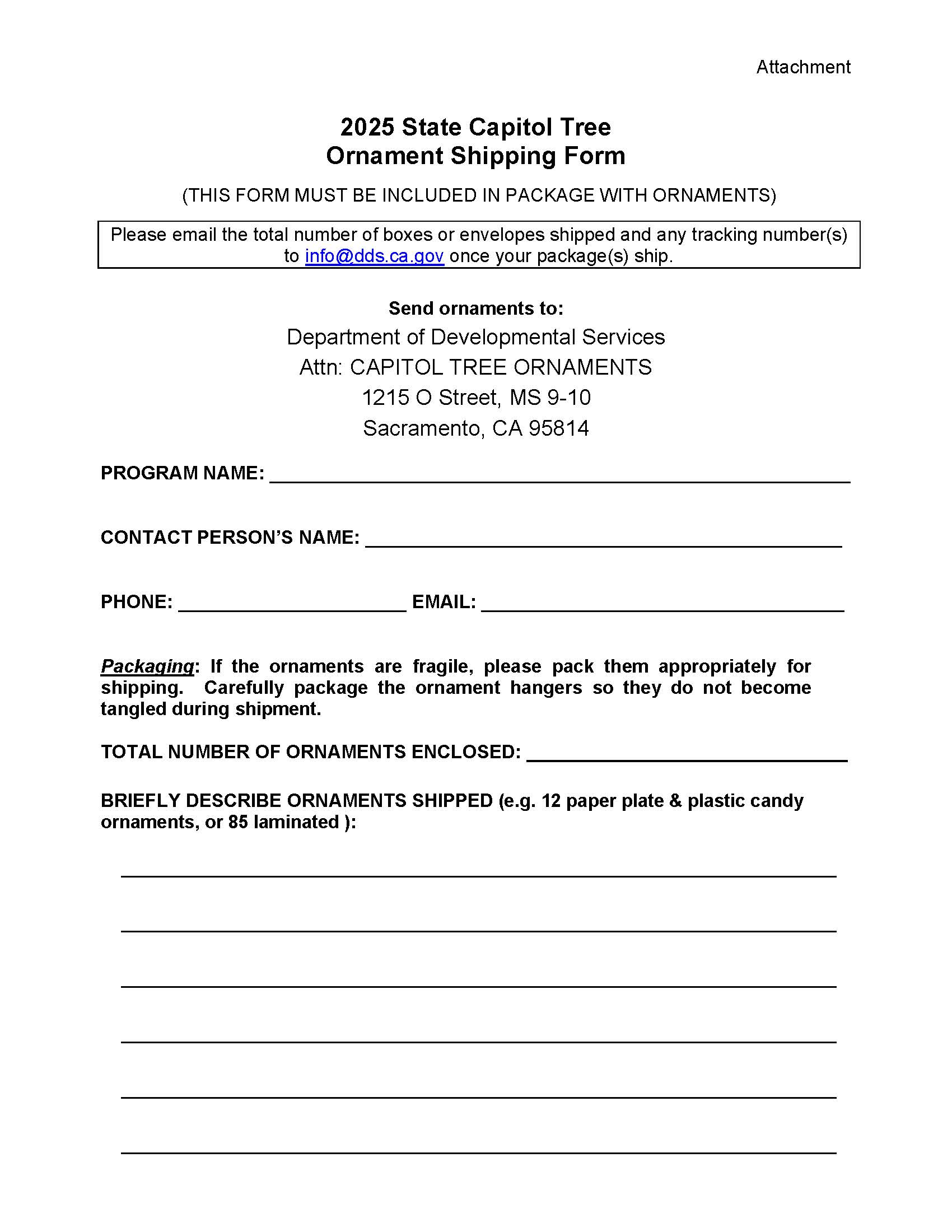 All ornaments must be received at Department’s Sacramento office by close of business on Thursday, November 13, 2025: