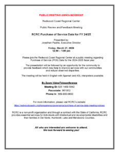 Please join the Redwood Coast Regional Center at a public meeting regarding Purchase of Service (POS) Data for the 2024-2025 fiscal year.