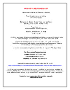Por favor, acompañe al Redwood Coast Regional Center en una reunión pública sobre los datos de Compra de Servicios (POS) para el año fiscal 2024-2025.