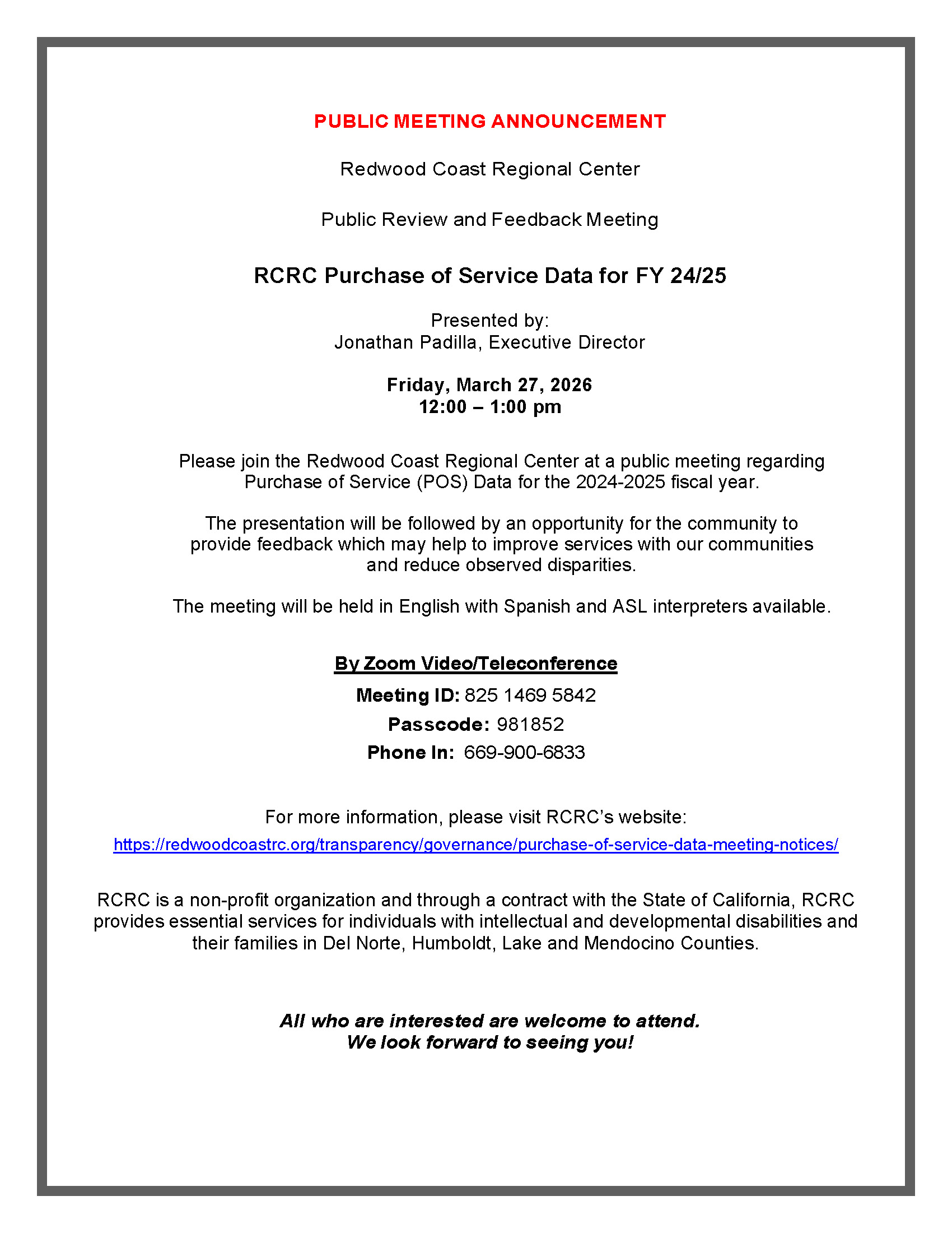 Please join the Redwood Coast Regional Center at a public meeting regarding Purchase of Service (POS) Data for the 2024-2025 fiscal year.
