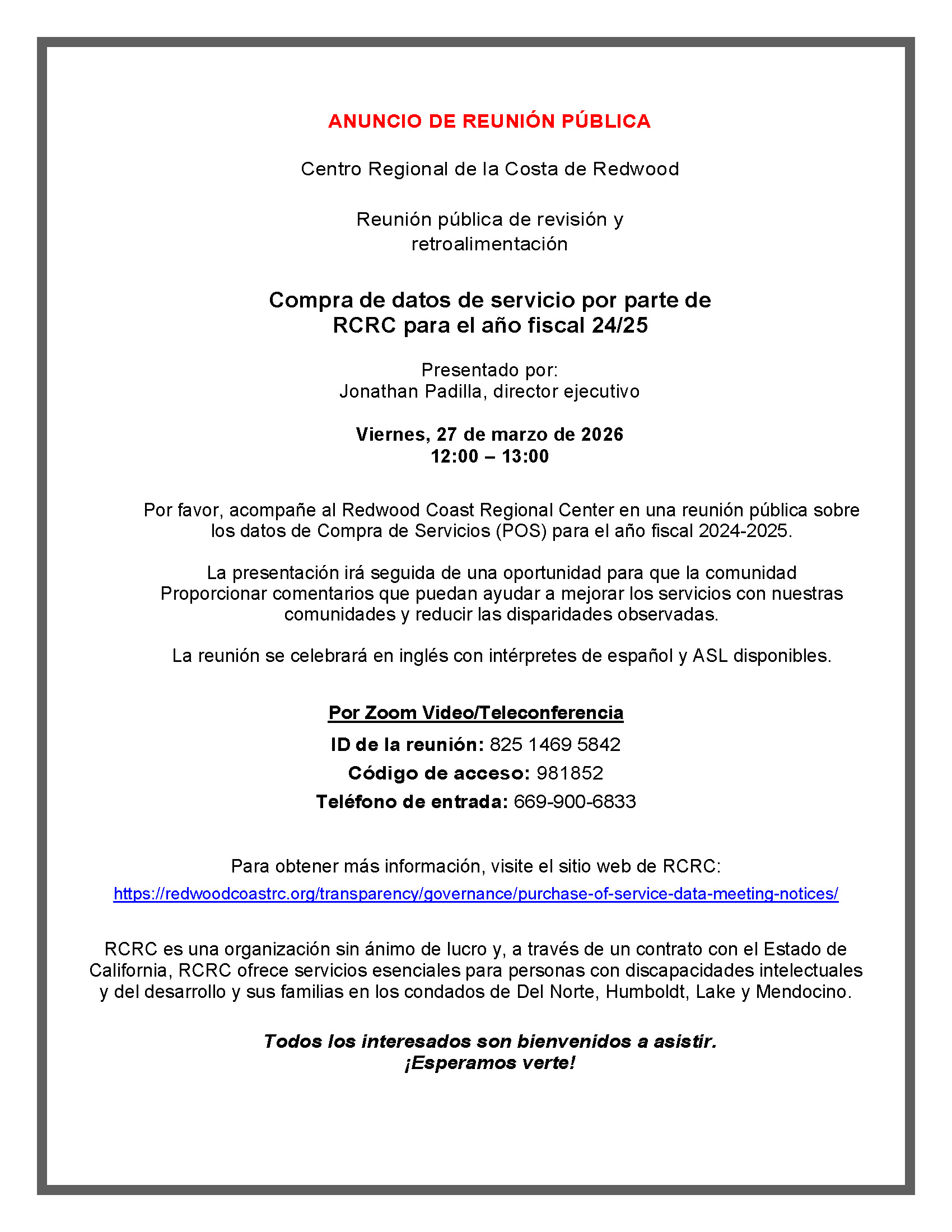 Por favor, acompañe al Redwood Coast Regional Center en una reunión pública sobre los datos de Compra de Servicios (POS) para el año fiscal 2024-2025.